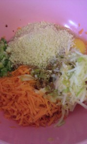 Next, squirt about a tablespoon ginger paste in the bowl, a few splashes of soy sauce (about a teaspoon or less), one egg, and about a cup of panko breadcrumbs. The egg and the breadcrumbs will help bind the burgers together – turkey can be a little fragile and with all the extra moisture you need a binder. The ginger and soy sauce go really well with the carrot flavor. I choose a low sodium soy sauce and don’t use any other salt in the recipe.