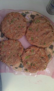 2. Mix will and divide into 4 patties. Place on cling wrap sprayed with cooking spray and coat with cooking spray on top to prevent from sticking to grill.