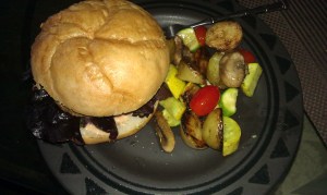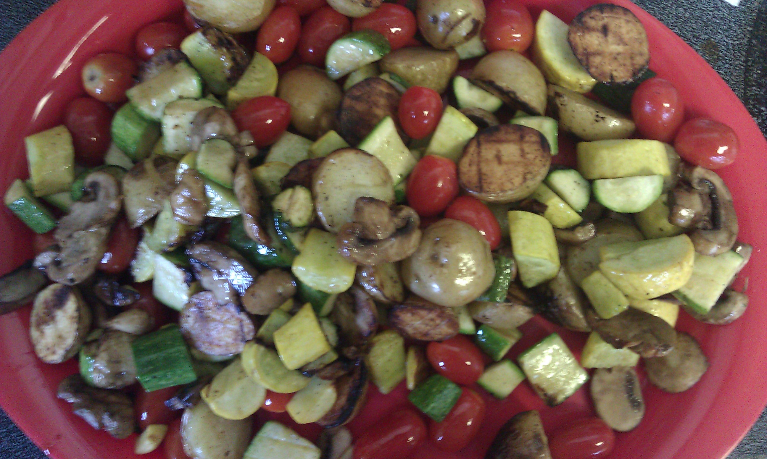 And don’t forget a healthy side…I choose grilled yellow squash, zucchini, potatoes, and cherry tomatoes…
