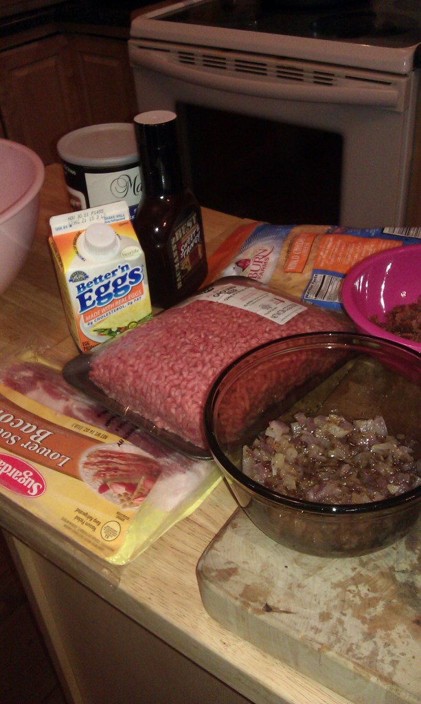 - Mix ground beef, onions, bacon, egg, breadcrumbs, and bbq sauce – meat mixture should be able to hold shape – add more breadcrumbs as needed.