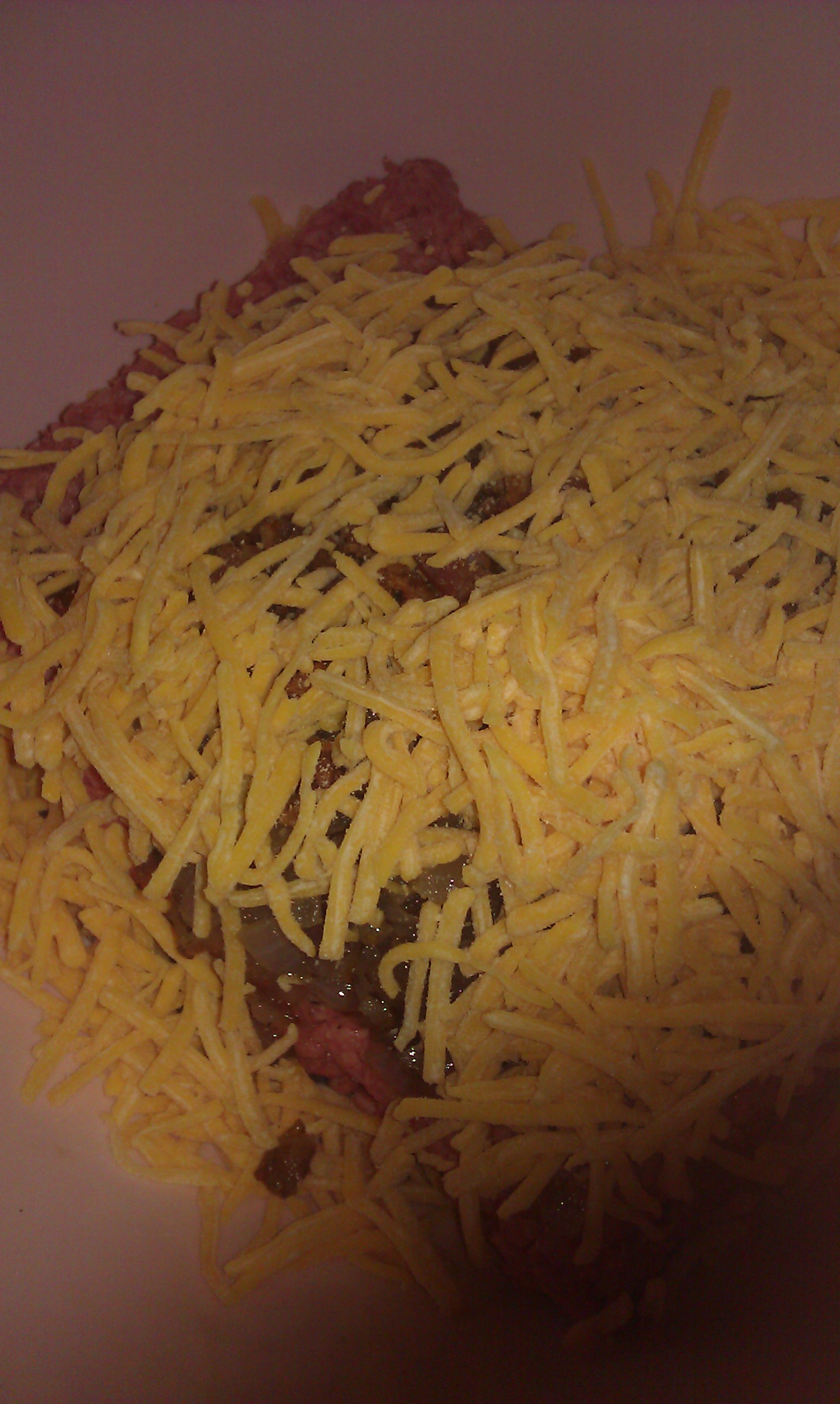 Allow both the onions and the bacon to cool off and preheat the oven to 350 degrees. Assemble your meatloaf ingredients and get mixing! The lineup includes ground beef, breadcrumbs, egg, bbq sauce, bacon, onions and cheddar cheese…